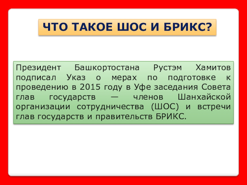 мерах по подготовке к проведению в 2015 году в Уфе заседания Совета глав государств — членов Шанхайской организации сотрудничества (ШОС) и встречи глав государств и правительств БРИКС.