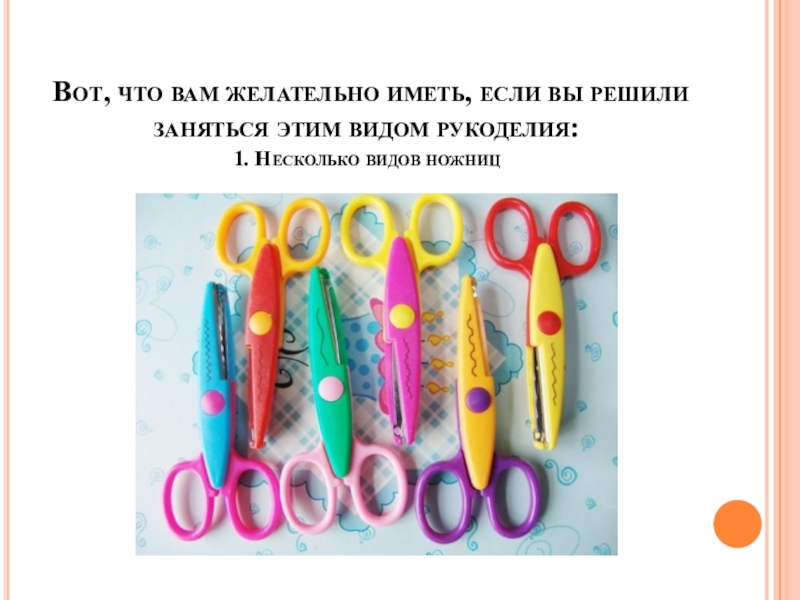 Вот, что вам желательно иметь, если вы решили заняться этим видом рукоделия: 1. Несколько видов ножниц