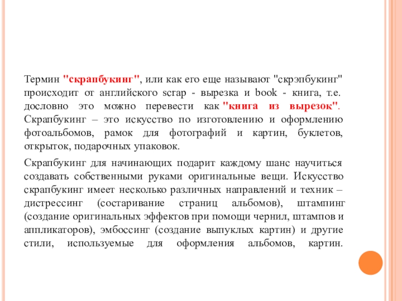 Слайд 2Термин "скрапбукинг", или как его еще называют "скрэпбукинг" происходит от английского scrap