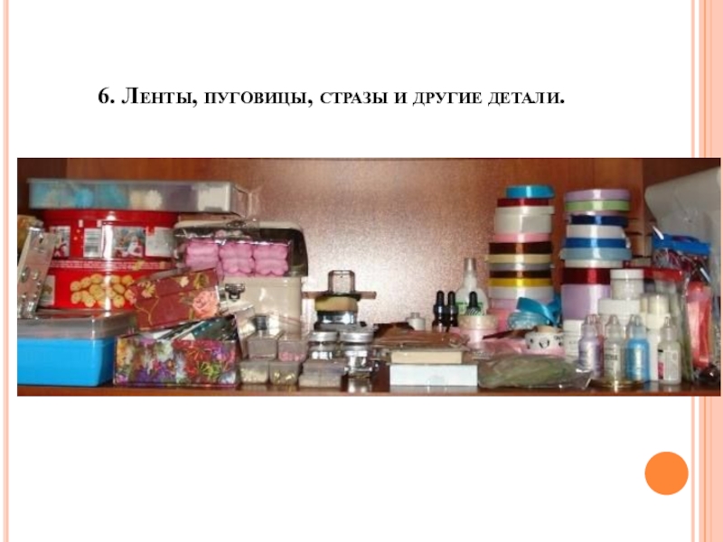 Слайд 146. Ленты, пуговицы, стразы и другие детали.