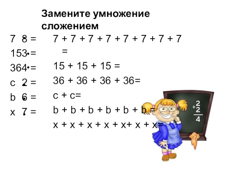 Замените умножение сложением7	8 =15	3 =36	4 =с	2 =b	6 =	x	7 =7 + 7 + 7 + 7 + 7