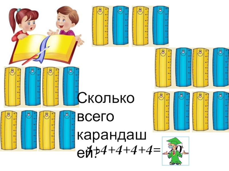 Сколько всего карандашей?4+4+4+4+4= 20