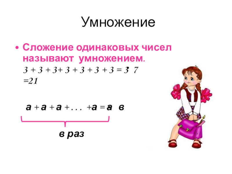 УмножениеСложение одинаковых чисел называют умножением. 3 + 3 + 3+ 3 + 3 + 3 + 3