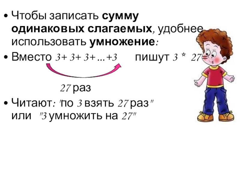 Чтобы записать сумму одинаковых слагаемых, удобнее использовать умножение:Вместо 3+ 3+ 3+ ...+3    пишут 3