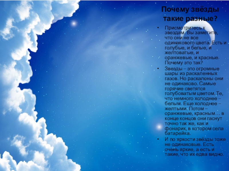 Почему звёзды такие разные?Присмотритесь к звездам. Вы заметите, что они не все одинакового цвета. Есть и голубые,