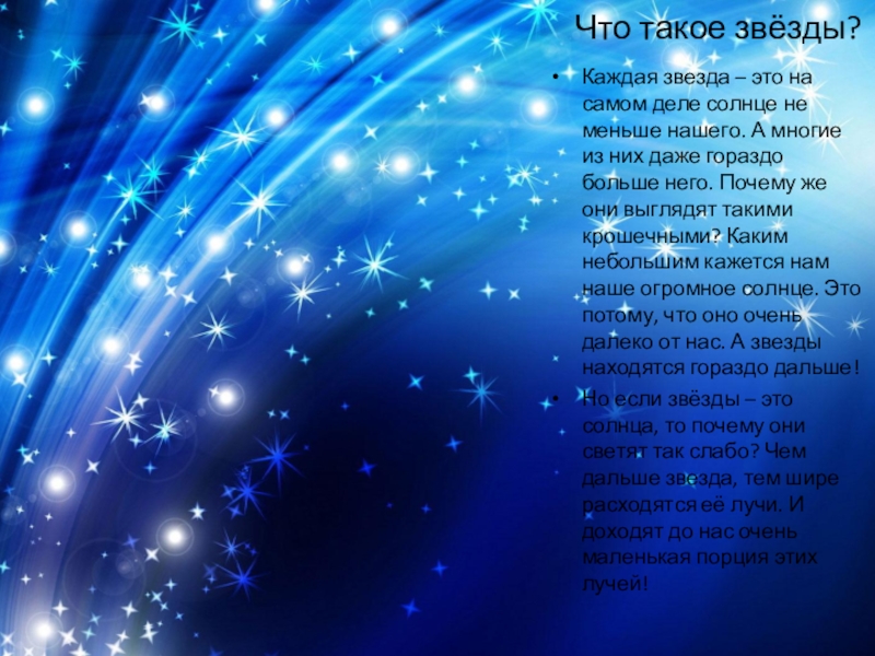 Что такое звёзды?Каждая звезда – это на самом деле солнце не меньше нашего. А многие из них даже гораздо больше него. Почему же они выглядят такими крошечными? Каким небольшим кажется нам наше огромное солнце. Это потому,