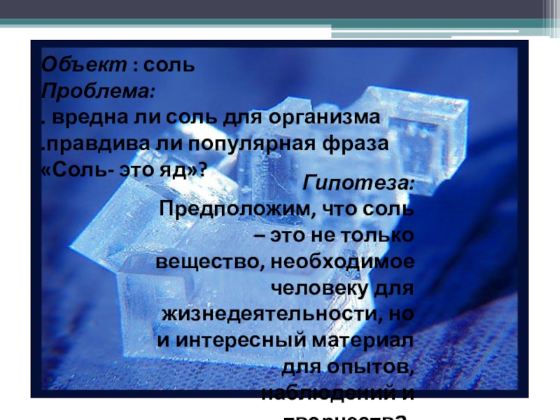 Предположим, что соль – это не только вещество, необходимое человеку для жизнедеятельности, но и интересный материал для опытов, наблюдений и творчества.