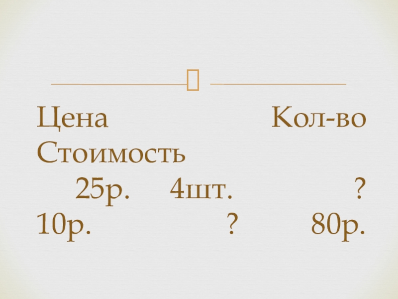 Слайд 10Цена Кол-во Стоимость 25р. 4шт. ? 10р.