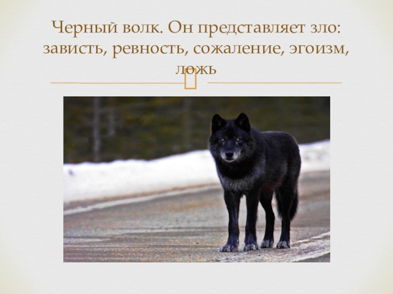 Слайд 3Черный волк. Он представляет зло: зависть, ревность, сожаление, эгоизм, ложь