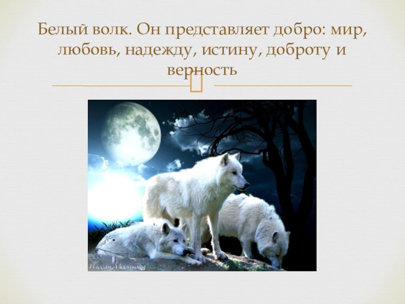 Слайд 4Белый волк. Он представляет добро: мир, любовь, надежду, истину, доброту и