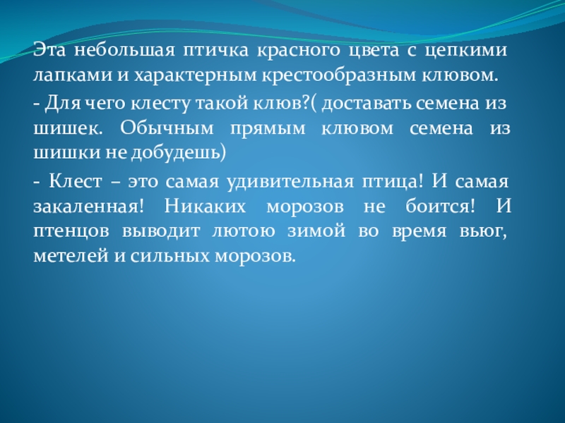 - Клест – это самая удивительная птица! И самая закаленная! Никаких морозов не боится! И птенцов выводит лютою зимой во время вьюг, метелей и сильных морозов.