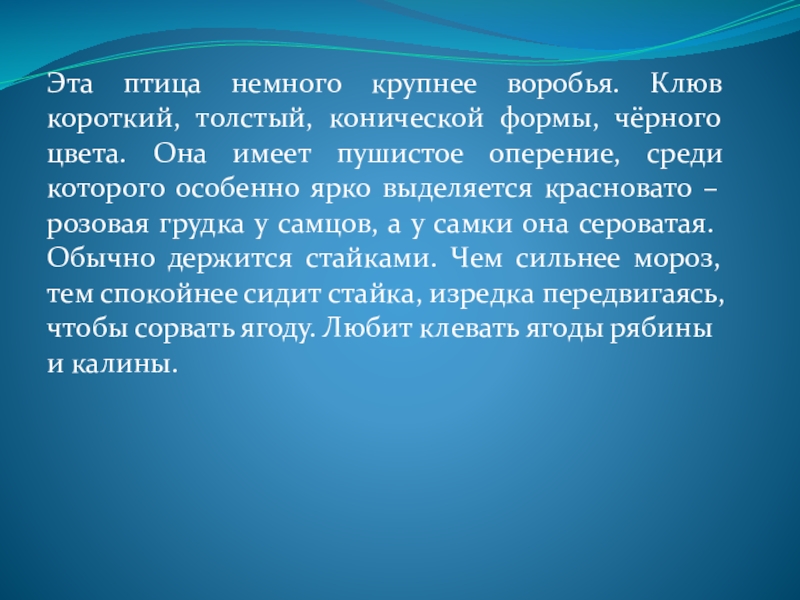 цвета. Она имеет пушистое оперение, среди которого особенно ярко выделяется красновато – розовая грудка у самцов, а у самки она сероватая. Обычно держится стайками. Чем сильнее мороз, тем спокойнее сидит стайка, изредка передвигаясь, чтобы сорвать ягоду. Любит клевать ягоды рябины и калины.