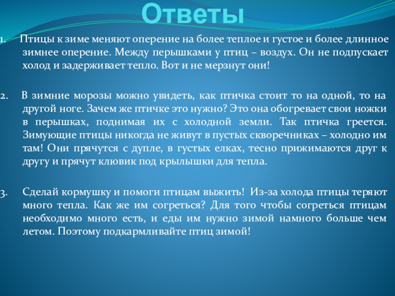 и густое и более длинное зимнее оперение. Между перышками у птиц – воздух. Он не подпускает холод и задерживает тепло. Вот и не мерзнут они!