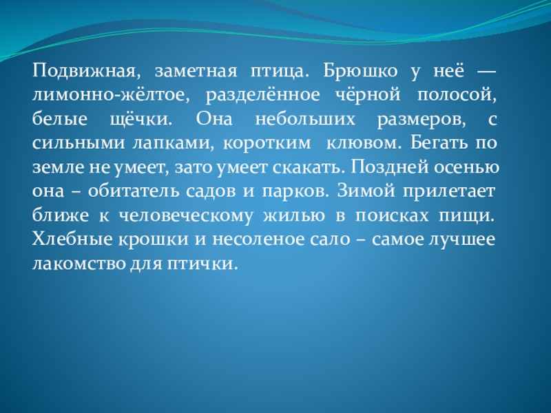 белые щёчки. Она небольших размеров, с сильными лапками, коротким клювом. Бегать по земле не умеет, зато умеет скакать. Поздней осенью она – обитатель садов и парков. Зимой прилетает ближе к человеческому жилью в поисках пищи. Хлебные крошки и несоленое сало – самое лучшее лакомство для птички.