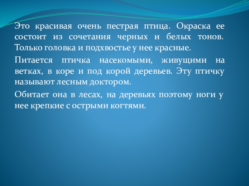 Слайд 12Это красивая очень пестрая птица. Окраска ее состоит из сочетания черных