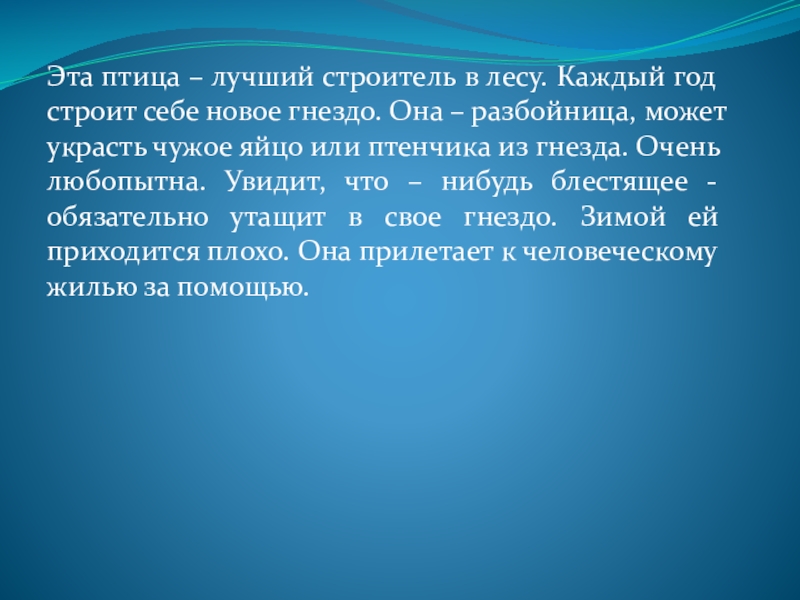 новое гнездо. Она – разбойница, может украсть чужое яйцо или птенчика из гнезда. Очень любопытна. Увидит, что – нибудь блестящее - обязательно утащит в свое гнездо. Зимой ей приходится плохо. Она прилетает к человеческому жилью за помощью.