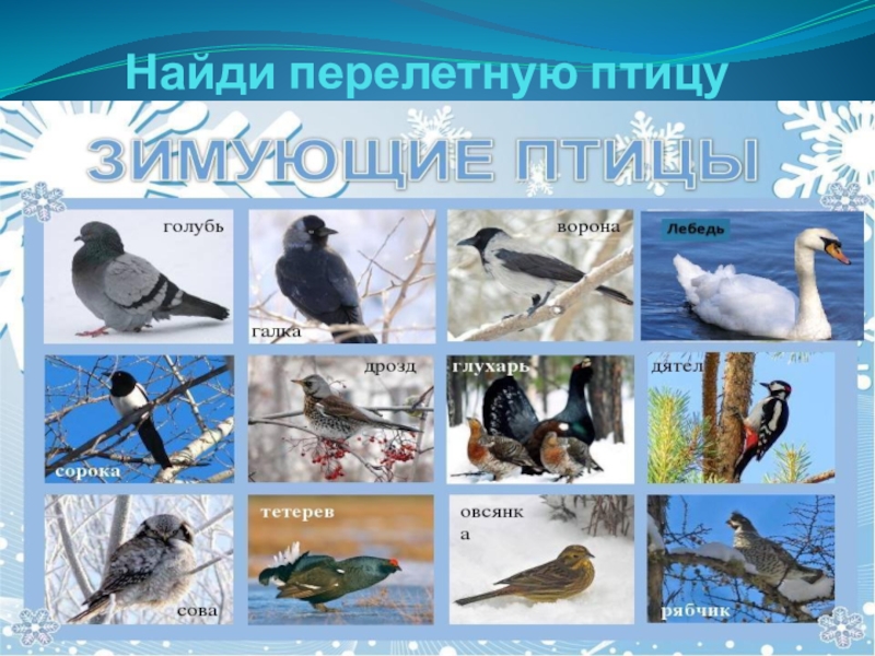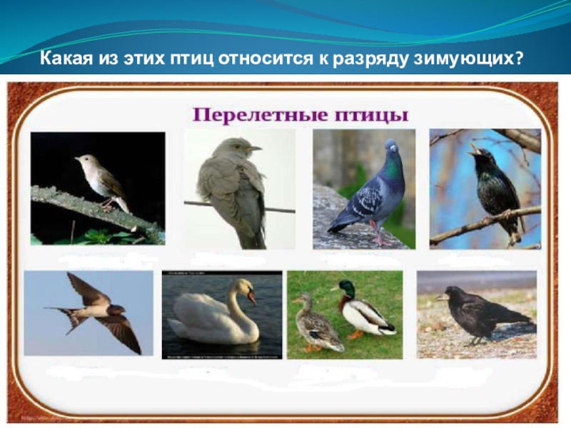 Слайд 28Какая из этих птиц относится к разряду зимующих?