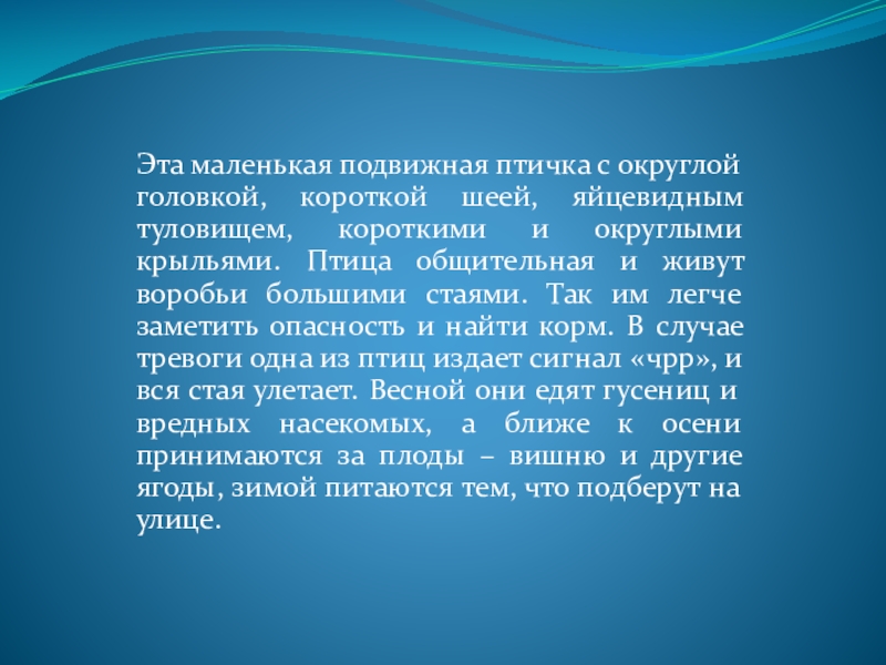 короткими и округлыми крыльями. Птица общительная и живут воробьи большими стаями. Так им легче заметить опасность и найти корм. В случае тревоги одна из птиц издает сигнал «чрр», и вся стая улетает. Весной они едят гусениц и вредных насекомых, а ближе к осени принимаются за плоды – вишню и другие ягоды, зимой питаются тем, что подберут на улице.