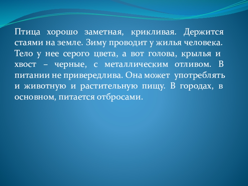 жилья человека. Тело у нее серого цвета, а вот голова, крылья и хвост – черные, с металлическим отливом. В питании не привередлива. Она может употреблять и животную и растительную пищу. В городах, в основном, питается отбросами.