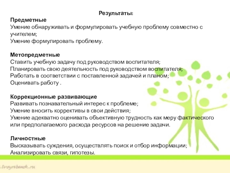 Результаты: Предметные Умение обнаруживать и формулировать учебную проблему совместно с учителем;Умение формулировать проблему.Метопредметные Ставить учебную задачу под