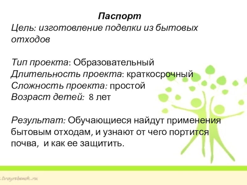 ПаспортЦель: изготовление поделки из бытовых отходов Тип проекта: ОбразовательныйДлительность проекта: краткосрочныйСложность проекта: простойВозраст детей: 8 летРезультат: Обучающиеся найдут применения бытовым отходам, и узнают от чего портится почва, и как ее защитить.