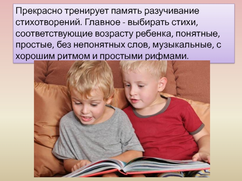 тренировка памяти – то есть заучивание стишков и песен (кроме того, что это поможет блеснуть на утреннике, такая привычка сослужит добрую службу и в школе);