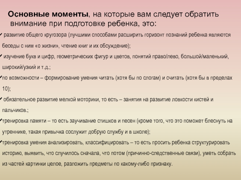 развитие общего кругозора (лучшими способами расширить горизонт познаний ребенка являются беседы с ним «о жизни», чтение книг и их обсуждение);