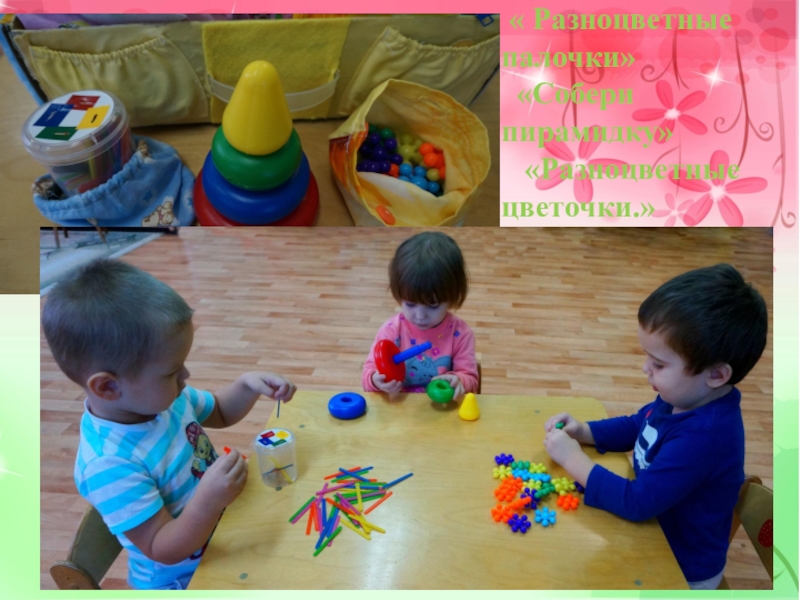 Слайд 8 « Разноцветные палочки» «Собери пирамидку» «Разноцветные цветочки.»