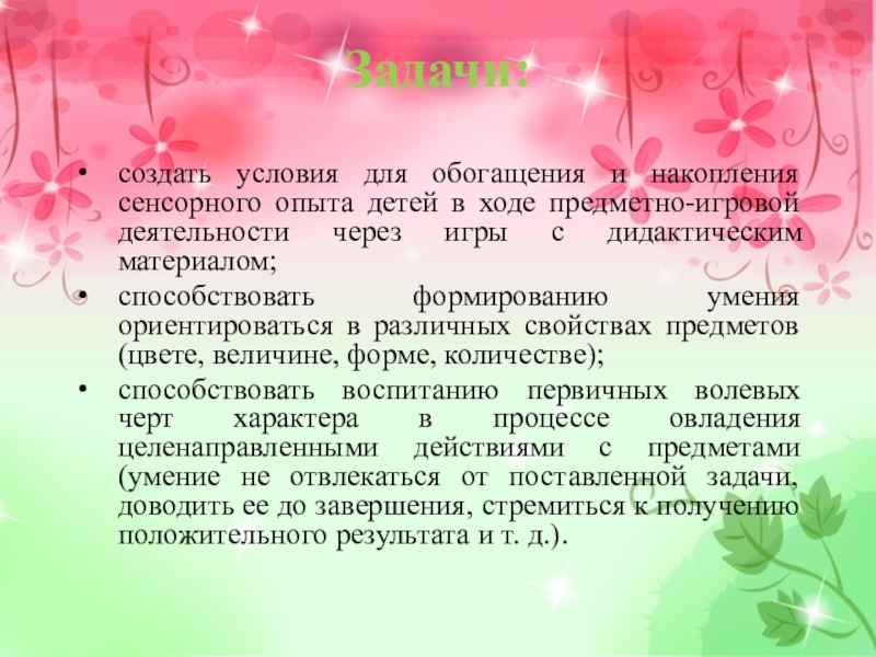 Задачи:создать условия для обогащения и накопления сенсорного опыта детей в ходе предметно-игровой деятельности через игры с дидактическим