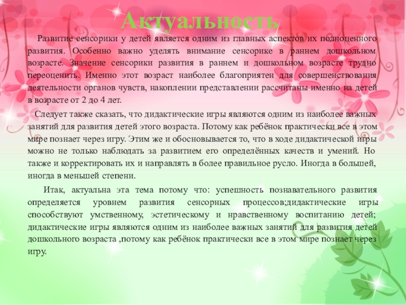Итак, актуальна эта тема потому что: успешность познавательного развития определяется уровнем развития сенсорных процессов;дидактические игры способствуют умственному, эстетическому и нравственному воспитанию детей; дидактические игры являются одним из наиболее важных занятий для развития детей дошкольного возраста ,потому как ребёнок практически все в этом мире познает через игру.