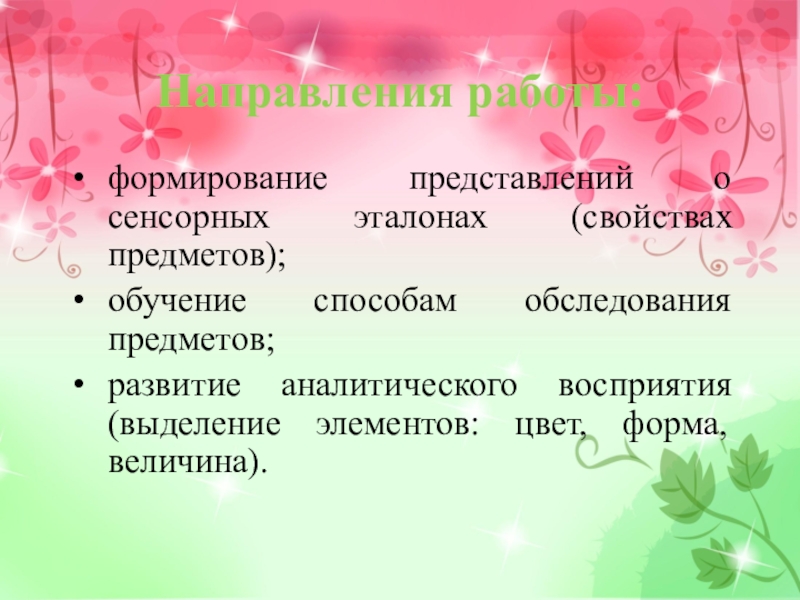 Направления работы:формирование представлений о сенсорных эталонах (свойствах предметов); обучение способам обследования предметов; развитие аналитического восприятия (выделение элементов: