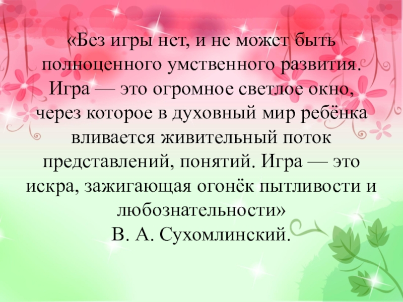 «Без игры нет, и не может быть полноценного умственного развития. Игра — это огромное светлое окно, через которое в духовный мир ребёнка вливается живительный поток представлений, понятий. Игра — это искра, зажигающая огонёк пытливости и любознательности»