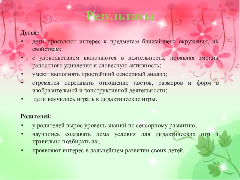 Результаты Детей:дети проявляют интерес к предметам ближайшего окружения, их свойствам; с удовольствием включаются в деятельность, проявляя эмоции