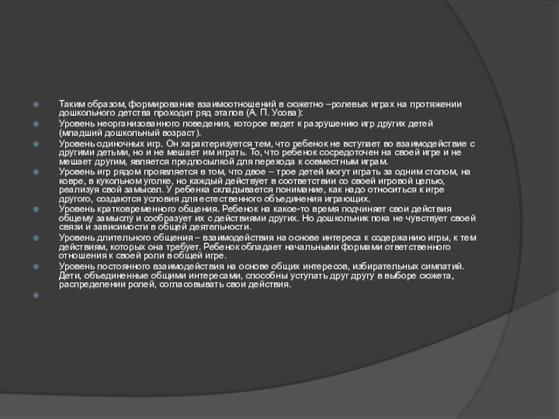 Слайд 10Таким образом, формирование взаимоотношений в сюжетно –ролевых играх на протяжении дошкольного