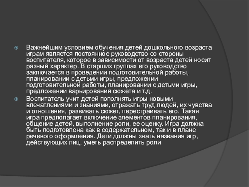 Слайд 7Важнейшим условием обучения детей дошкольного возраста играм является постоянное руководство со
