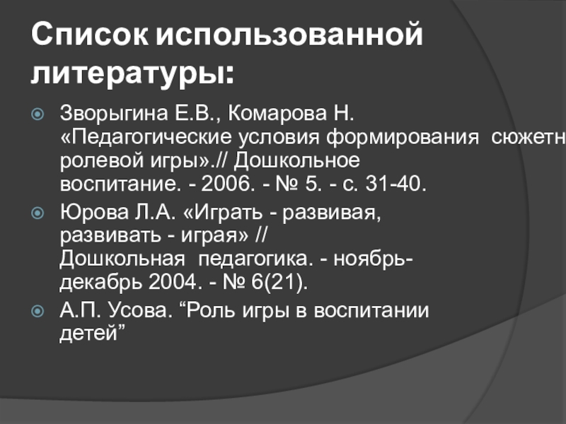 Зворыгина Е.В., Комарова Н. «Педагогические условия формирования сюжетно-ролевой игры».//