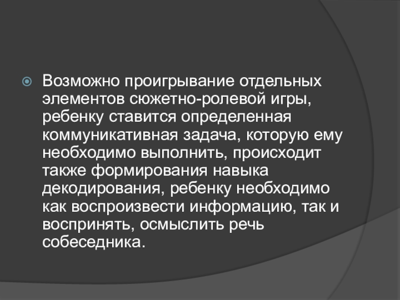Слайд 9Возможно проигрывание отдельных элементов сюжетно-ролевой игры, ребенку ставится определенная коммуникативная задача,