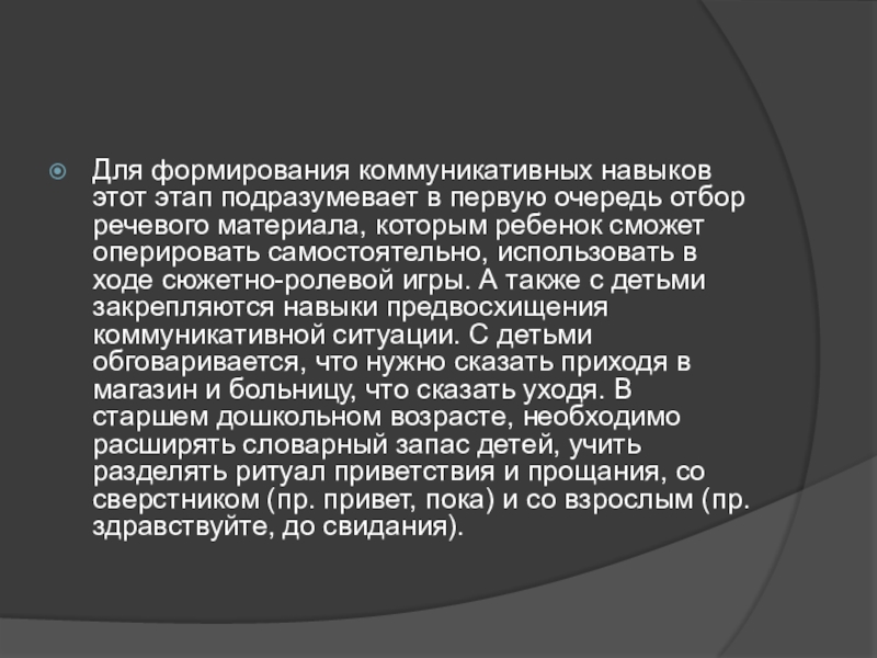 оперировать самостоятельно, использовать в ходе сюжетно-ролевой игры. А также с детьми закрепляются навыки предвосхищения коммуникативной ситуации. С детьми обговаривается, что нужно сказать приходя в магазин и больницу, что сказать уходя. В старшем дошкольном возрасте, необходимо расширять словарный запас детей, учить разделять ритуал приветствия и прощания, со сверстником (пр. привет, пока) и со взрослым (пр. здравствуйте, до свидания).