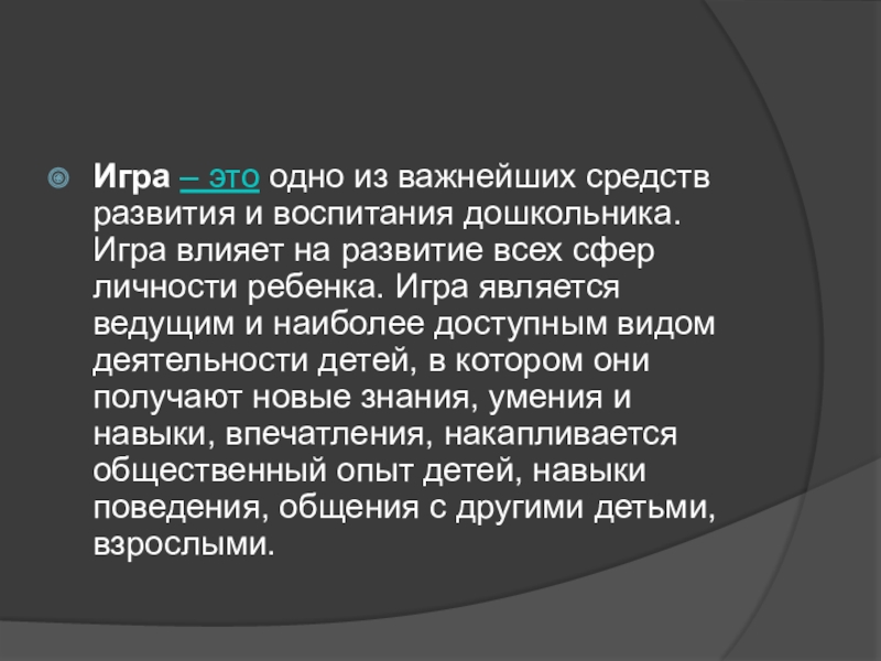 Слайд 3Игра – это одно из важнейших средств развития и воспитания дошкольника. Игра влияет