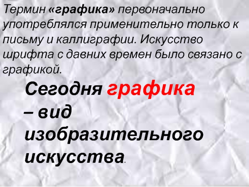 Сегодня графика – вид изобразительного искусства.Термин «графика» первоначально употреблялся применительно только к письму и каллиграфии. Искусство шрифта с давних времен было связано с графикой.