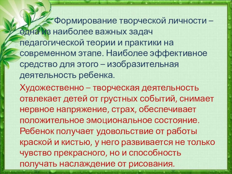 Художественно – творческая деятельность отвлекает детей от грустных событий, снимает нервное напряжение, страх, обеспечивает положительное эмоциональное состояние. Ребенок получает удовольствие от работы краской и кистью, у него развивается не только чувство прекрасного, но и способность получать наслаждение от рисования.