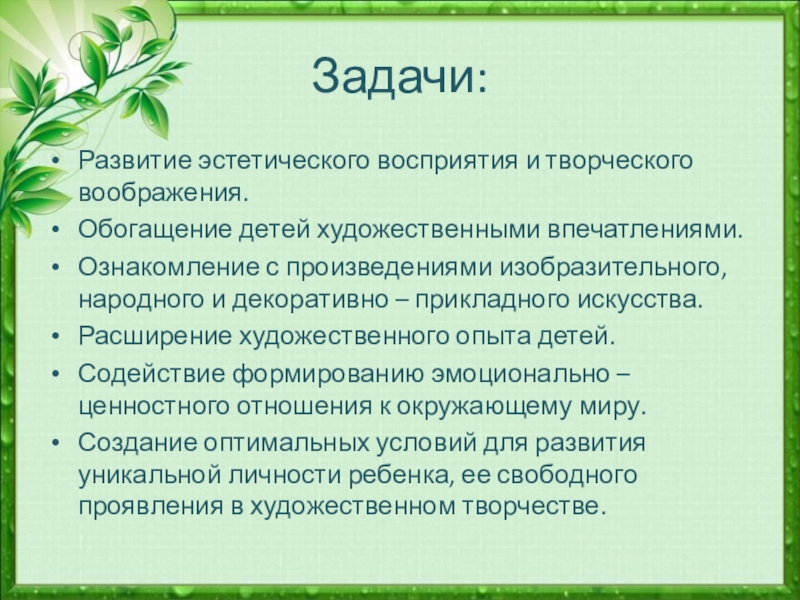 Создание оптимальных условий для развития уникальной личности ребенка, ее свободного проявления в художественном творчестве.