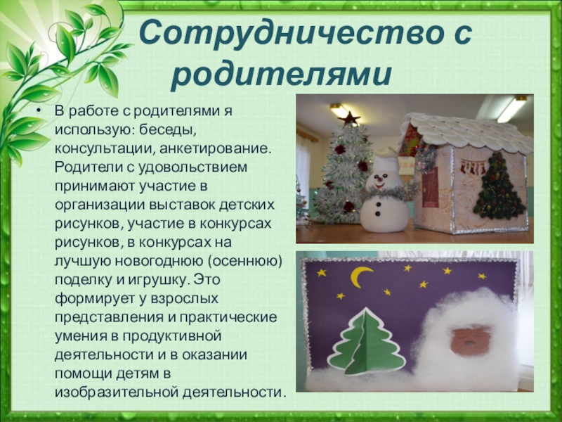 беседы, консультации, анкетирование. Родители с удовольствием принимают участие в организации выставок детских рисунков, участие в конкурсах рисунков, в конкурсах на лучшую новогоднюю (осеннюю) поделку и игрушку. Это формирует у взрослых представления и практические умения в продуктивной деятельности и в оказании помощи детям в изобразительной деятельности.