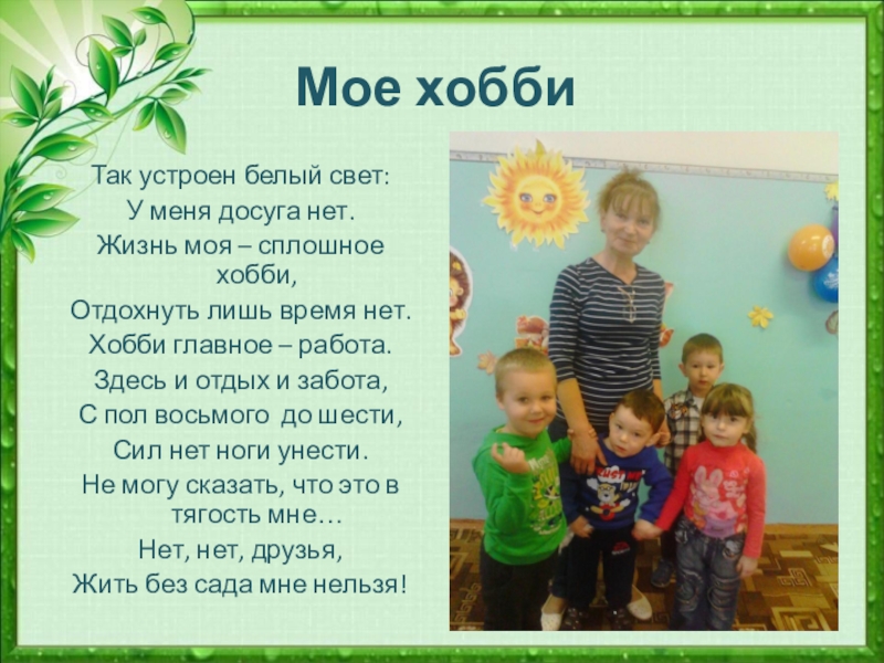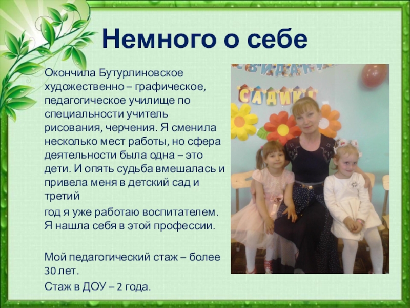 учитель рисования, черчения. Я сменила несколько мест работы, но сфера деятельности была одна – это дети. И опять судьба вмешалась и привела меня в детский сад и третий