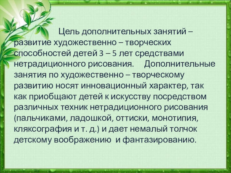 Цель дополнительных занятий – развитие художественно – творческих способностей детей 3 – 5 лет средствами нетрадиционного рисования. Дополнительные занятия по художественно – творческому развитию носят инновационный характер, так как приобщают детей к искусству посредством различных техник нетрадиционного рисования (пальчиками, ладошкой, оттиски, монотипия, кляксография и т. д.) и дает немалый толчок детскому воображению и фантазированию.