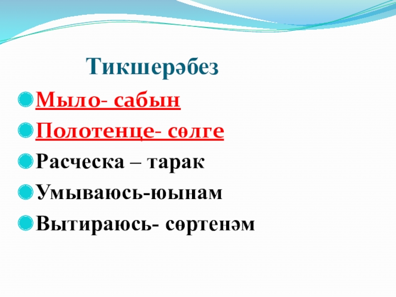 Тикшерәбез Мыло- сабынПолотенце- сөлгеРасческа – тарак Умываюсь-юынамВытираюсь- сөртенәм