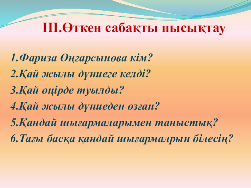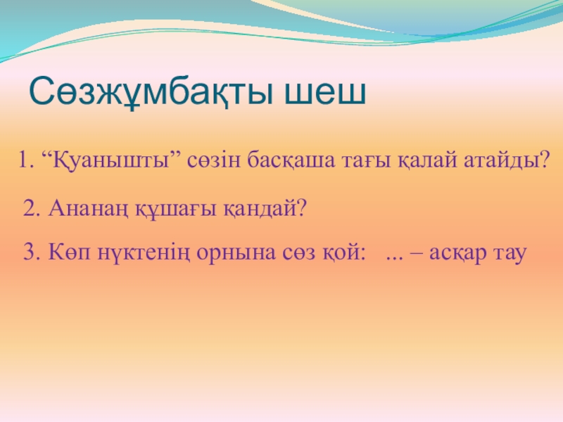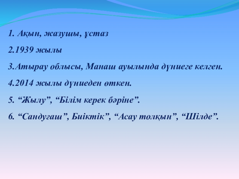 6. “Сандуғаш”, Биіктік”, “Асау толқын”, “Шілде”.