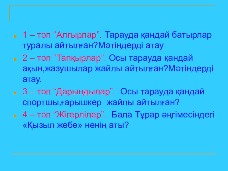 Слайд 41 – топ “Алғырлар”. Тарауда қандай батырлар туралы айтылған?Мәтіндерді атау