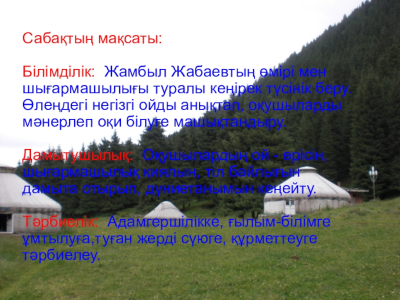 Сабақтың мақсаты:  Білімділік: Жамбыл Жабаевтың өмірі мен шығармашылығы туралы кеңірек түсінік беру. Өлеңдегі негізгі ойды анықтап,