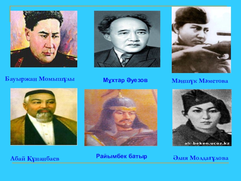 Бауыржан Момышұлы   Абай ҚұнанбаевӘлия Молдағұлова Мәншүк МәметоваМұхтар ӘуезовРайымбек батыр